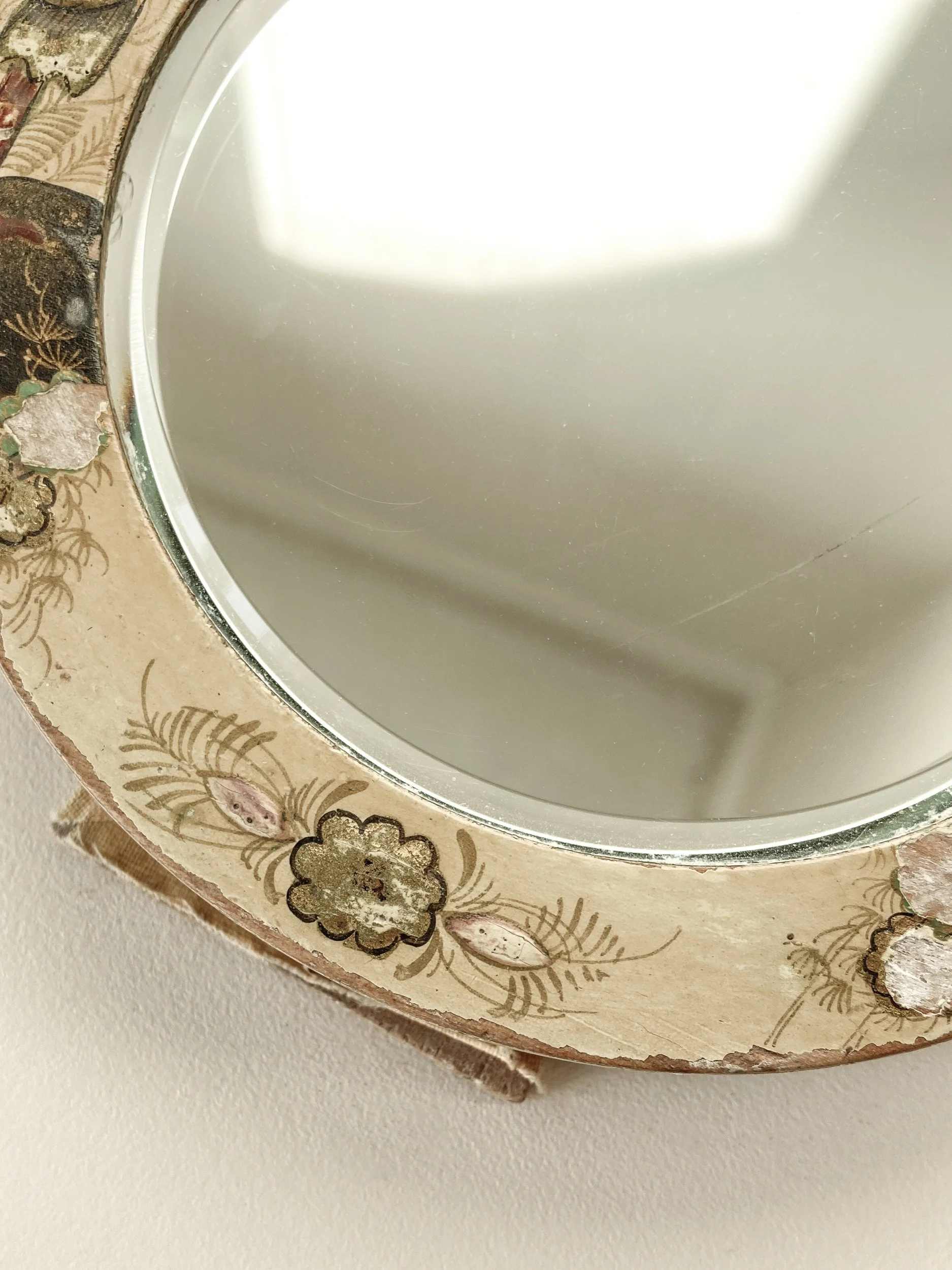 A petite Chinoiserie round bevelled table mirror with hinged stand c.1920, with stylised figures and scene intricately hand-painted onto the wood surface.