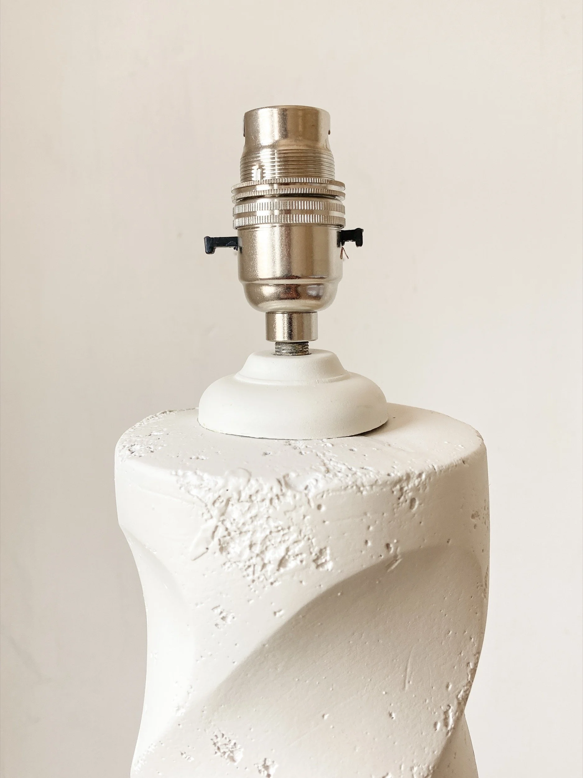 Each standing at over 50cm high, a pair of sculptural and wonderfully proportioned American plaster cast lamps in the manner of Michael Taylor. Heavy and solid despite their hollow interior with an artfully textured surface, gently twisting in spirals to a flared round base. The original plaster surface had been varnished at some point and subsequently overpainted to mimic the original off-white matte plaster finish.